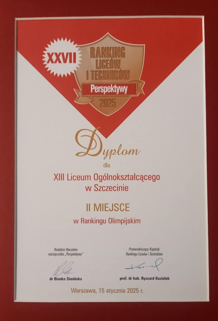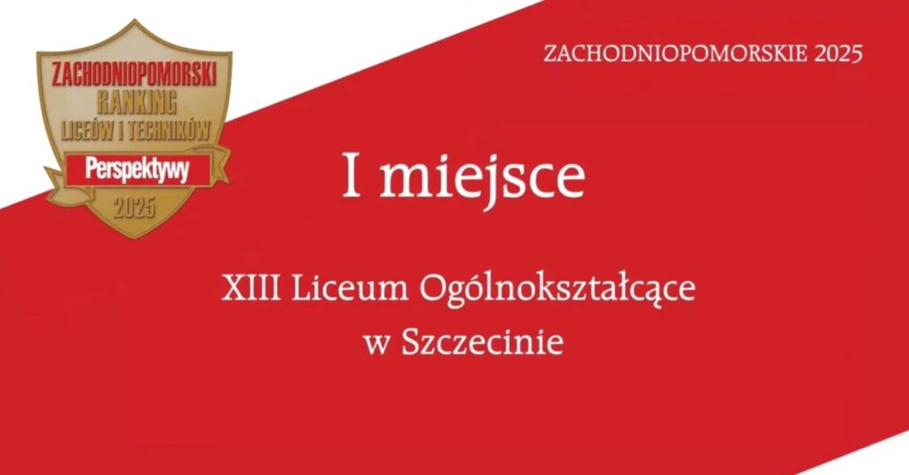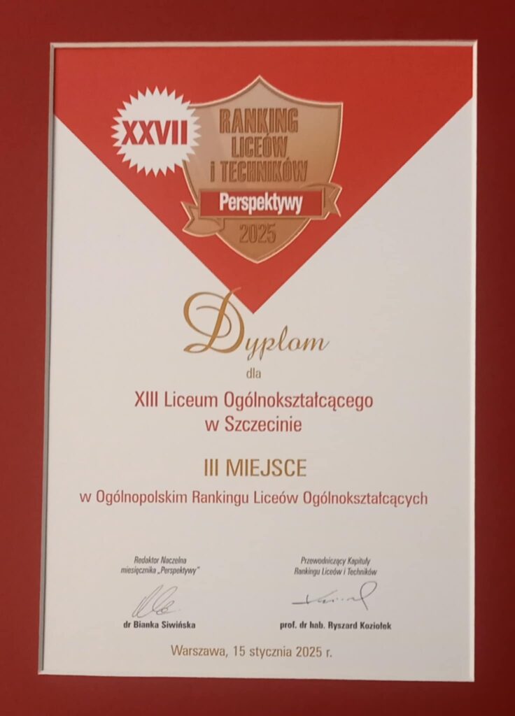 Z olbrzymią satysfakcją przyjęliśmy (po raz 24. z rzędu) informację o miejscu XIII LO w ścisłej czołówce rankingu liceów. Tak jak w poprzednich czterech latach zajęliśmy w nim trzecie miejsce.